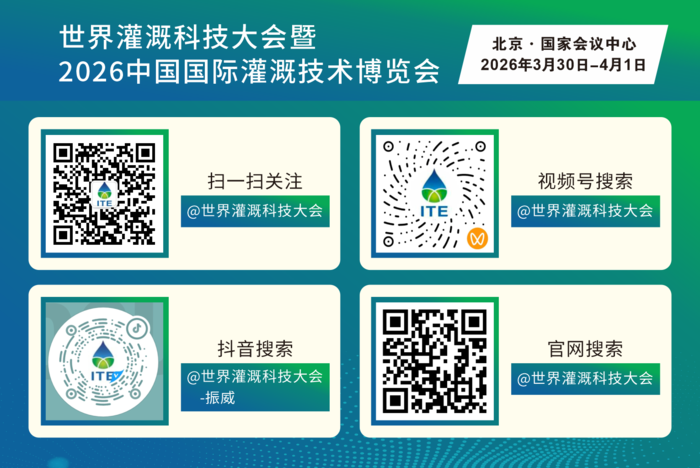 作为经商务部批准、UFI 认证的 "国字号" 盛会,世界灌溉科技大会暨2026中国国际灌溉技术博览会以 "创新赋能农业,灌溉引领未来" 为主题,定于2026 年 3 月 30 日 - 4 月 1 日在北京国家会议中心举办,展会面积 3 万平方米,将汇聚30 余个国家的 800 余家领军企业及3.5 万余名专业观众